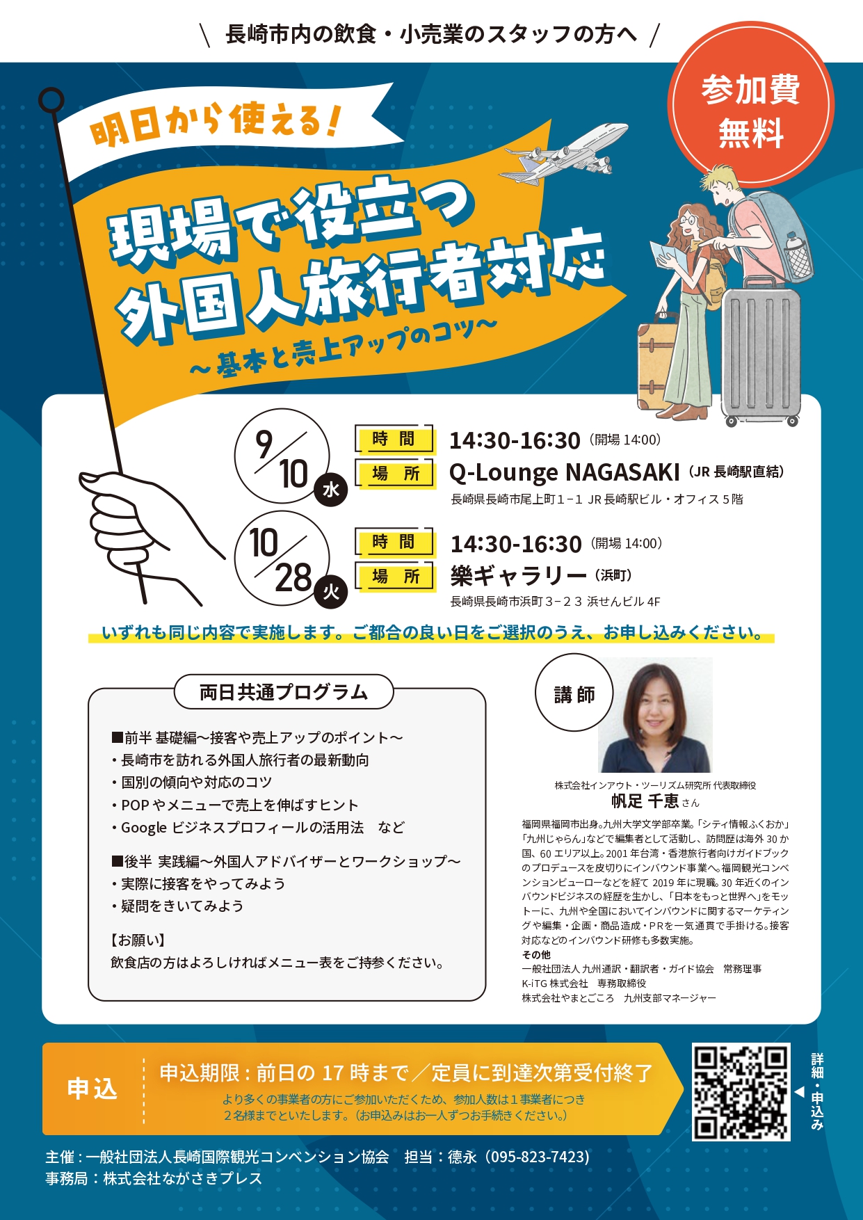 この度、一般社団法人長崎国際観光コンベンション協会(DMO NAGASAKI)は、長崎市内の飲食店やお土産など小売店のスタッフの方を対象に、外国人旅行者対応や売上アップのコツをお伝えし、参加者の皆様と接客の実践を行うセミナーを開催いたします。